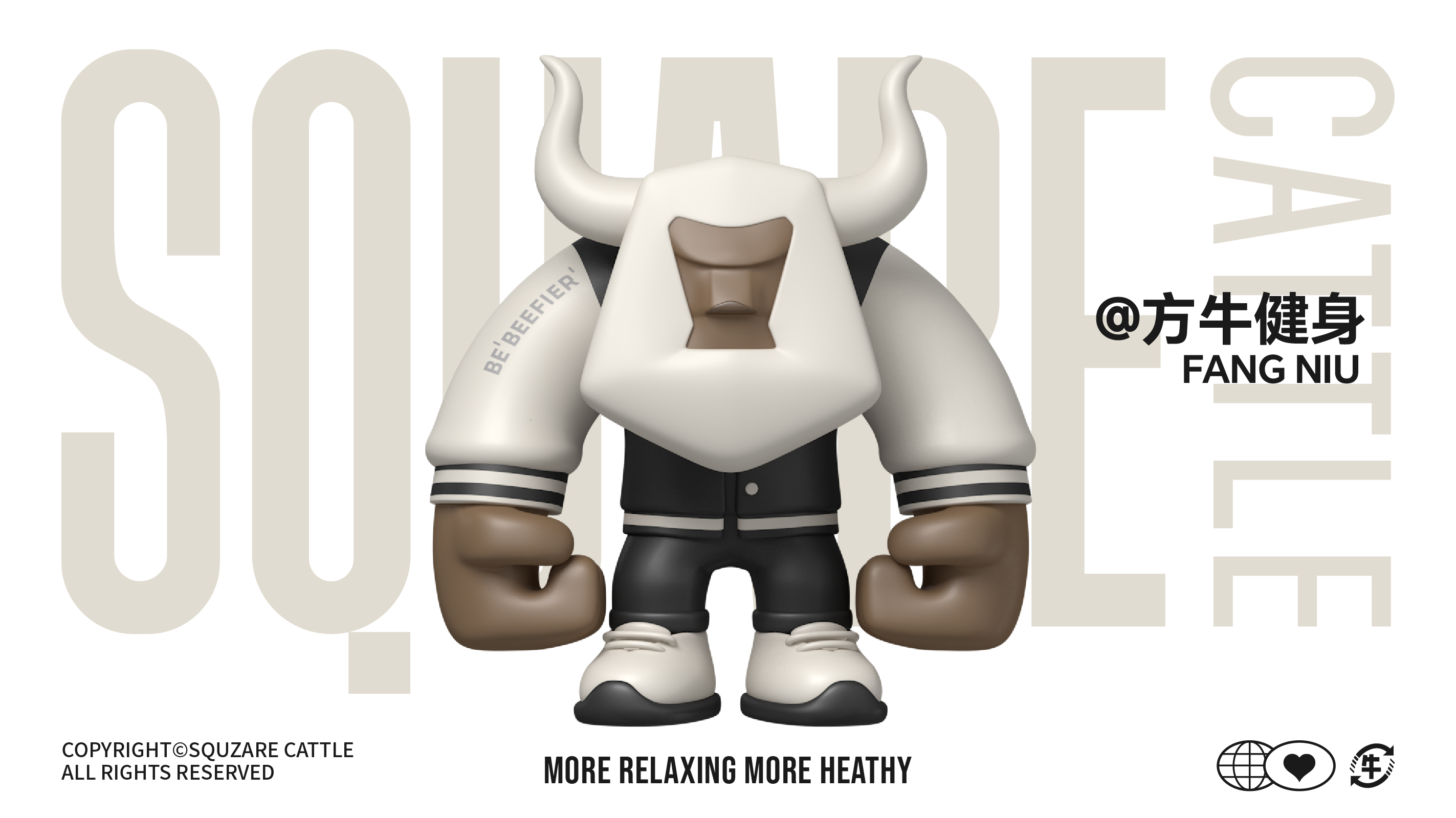 品牌IP化是以情感連接為導向的傳播方式。基于核心價值,在IP符號的選擇上,我們決定以品牌精神和健身人群的情感為源,選擇大眾熟知的動物形象。在分析了眾多動物特征后,我們發(fā)現(xiàn),牛正是低調、堅韌的代表。此外,它健壯的外形也與健身人群的特征符合。于是,Sqaure Cattle方牛健身這一品牌名應運而生。牛不僅是名詞,還是形容詞,既能成為視覺符號,又能作為強有力的語言輸出——方牛就是牛。